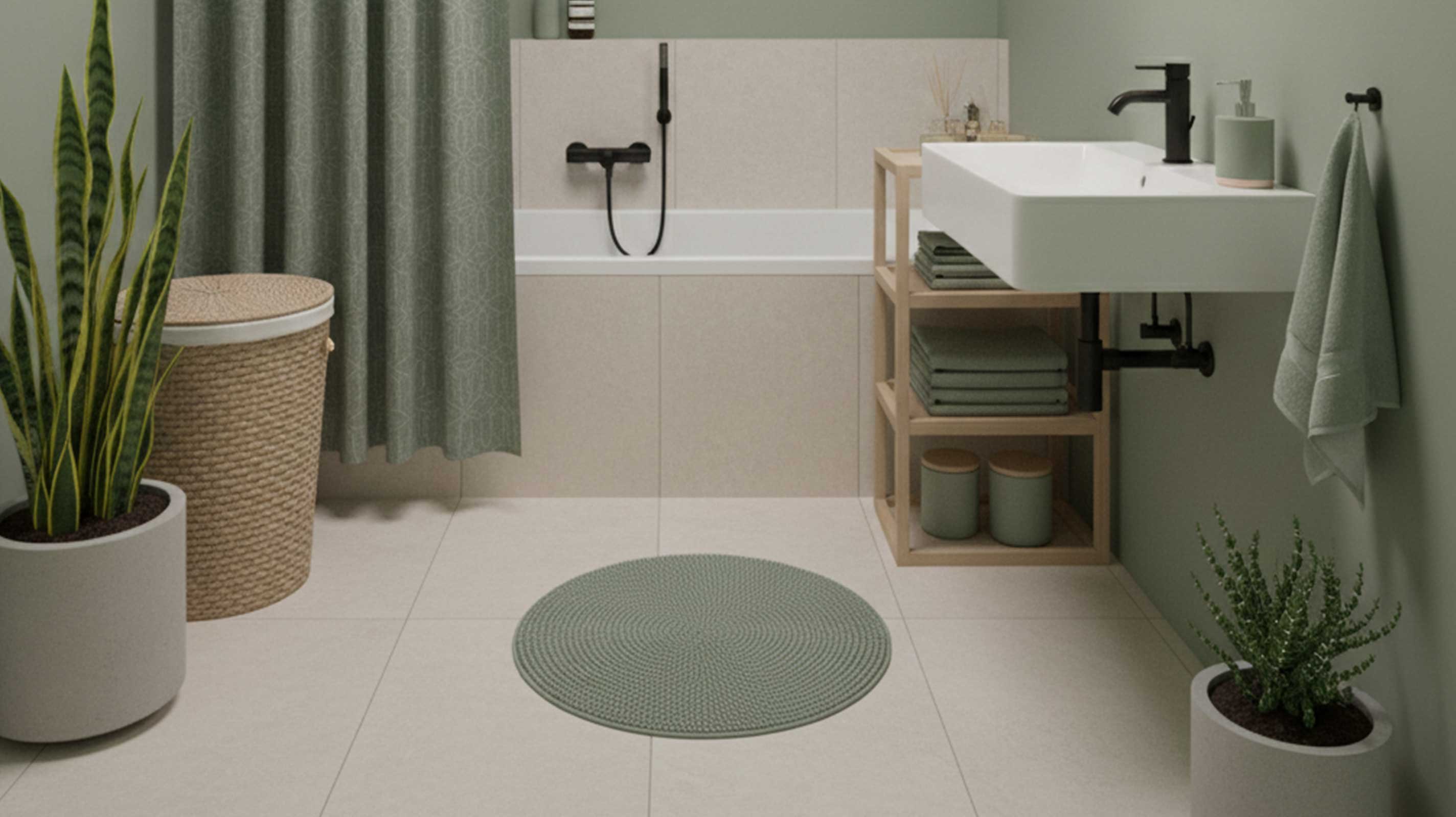 Ein Badezimmer in Salbeigrün wirkt ruhig, natürlich und modern. Erfahre, wie du Sage Green mit Holz, warmen Neutraltönen und passender Beleuchtung kombinierst.