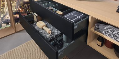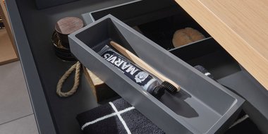 Der symmetrische Doppelwaschplatz mit vier Auszügen und offenem, breitenvariablen Regal bietet spielend Platz für zwei. Seine pflegeleichte, schwarz matte Oberfläche mit Anti-Fingerprint-Effekt steht in gekonntem Kontrast zum hellen Holzton der 2morrow Platte Slim. Einen edlen Touch verleihen die Griffe in Gold Matt mit dazu passenden Wandarmaturen. Die beiden auffälligen, runden Reflection Lichtspiegel LOLA sorgen für stimmungsvolles Licht, das per Raumschaltung bedient wird.