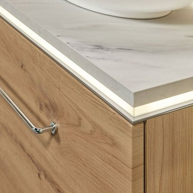Ambiente besonders freundlich und überzeugt mit seinem Platzangebot. Breitenvariables Regal mit Melamineinlegeboden ist in individueller Breite bestellbar und ermöglicht zusammen mit den Schränken einen Waschplatz nach Maß oder auch den passgenauen Einbau eines Möbels in Nischen Sanfte Beleuchtung und aufgeräumte Ruhe.